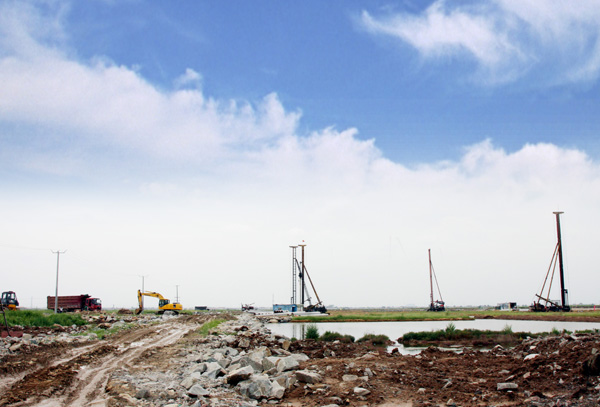 工程部徐經(jīng)理介紹到,中復(fù)新水源徐圩項(xiàng)目是徐圩新區(qū)基礎(chǔ)建設(shè)工程,包括一個(gè)面積為139.7畝的水廠,一個(gè)面積為144畝的污水處理廠和外圍配套管網(wǎng)120公里,總工期14個(gè)月。項(xiàng)目部組建已經(jīng)一個(gè)月了,項(xiàng)目前期建設(shè)事宜正在按計(jì)劃推進(jìn),專(zhuān)家隊(duì)伍、管理隊(duì)伍已經(jīng)就位;樁基工程正在施工;土建工程已經(jīng)發(fā)出招標(biāo)公告;設(shè)備正在編制清單和技術(shù)規(guī)格書(shū)。項(xiàng)目地處徐圩鹽田,地質(zhì)條件復(fù)雜,地表至負(fù)13米左右均為淤泥層,承載力差,累計(jì)要打下十萬(wàn)多米的樁基。